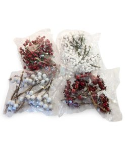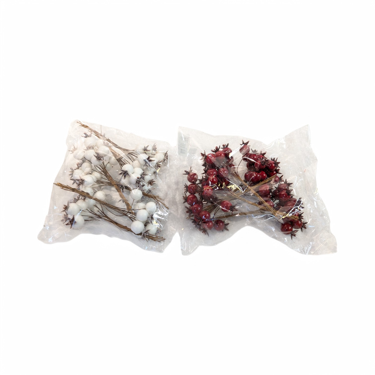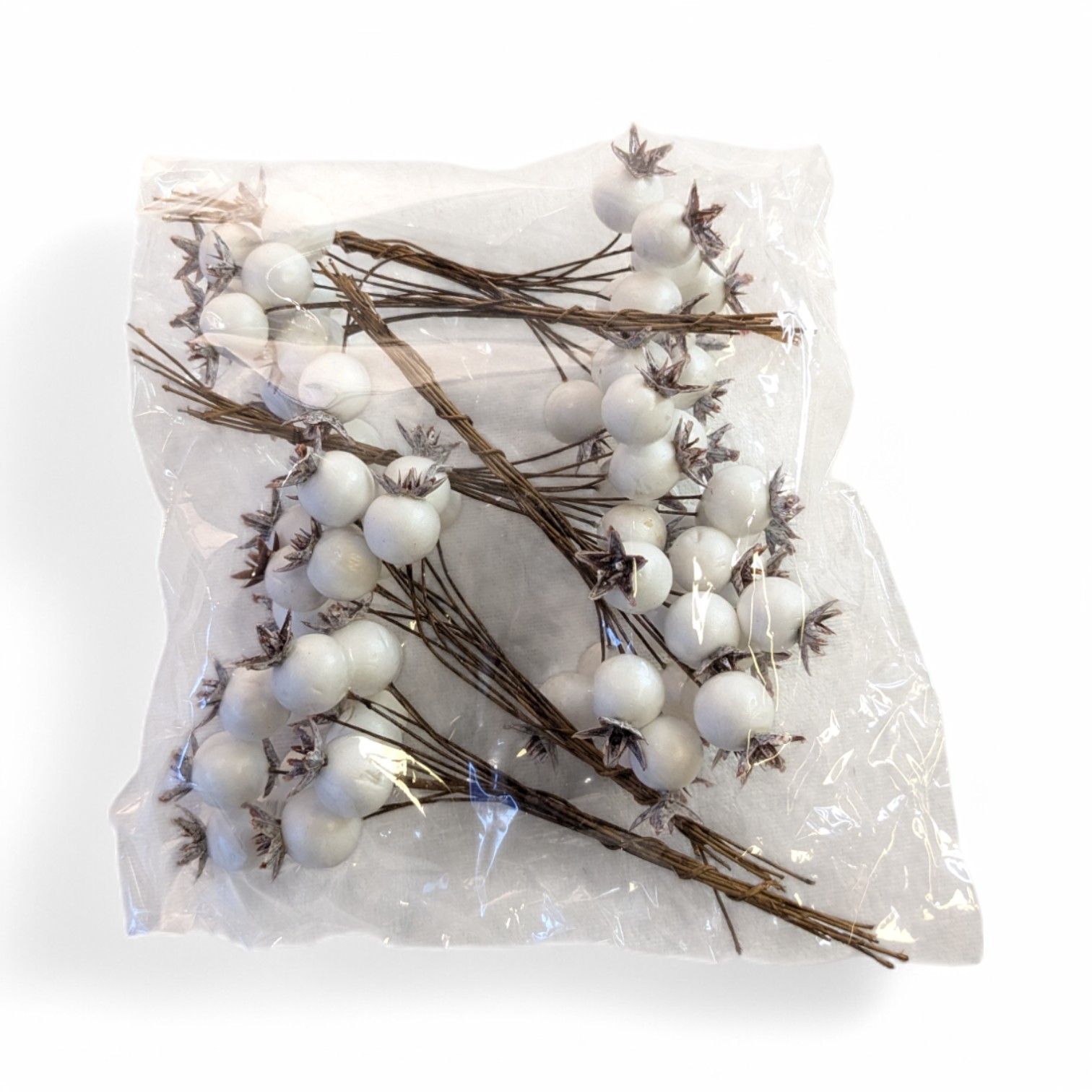 Kunstige hvite bær med frøstand på stengel. 72 stk. pr. pose. Bruk naturtro bær i dine dekorasjoner. Stengelen med bær måler 12 cm. Materiale er skum. 6 bunter á 12 bær. Stengelen er både stiv og bøyelig, så det er lett å sette den fast i enten leire eller oasis. Vi har flere forskjellige typer kunstige bærstengler i hvite og røde.