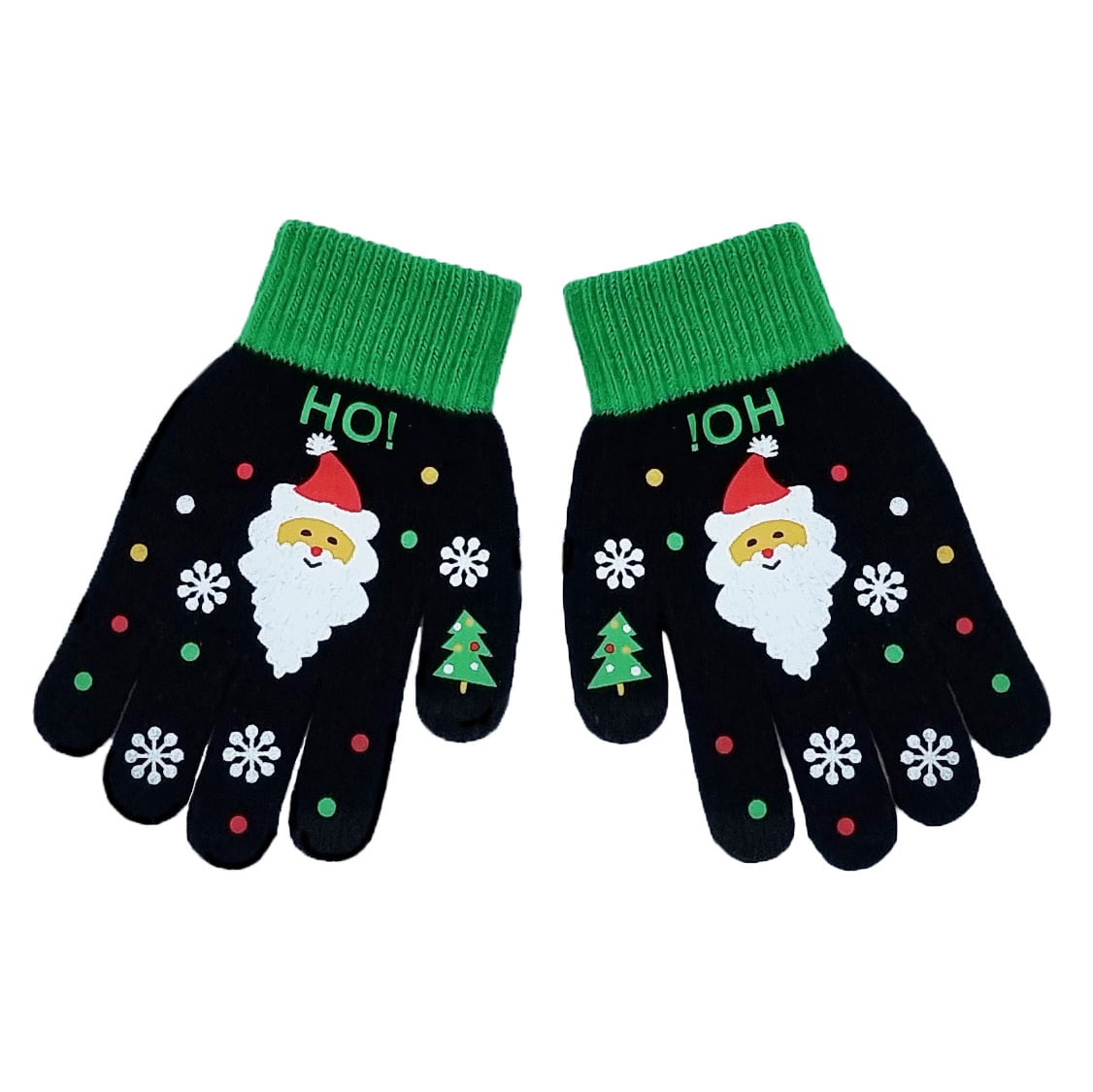 Barnehansker med julenisse, juletre og snøfnugg i svart med grønn ribbekant med mobil touch.