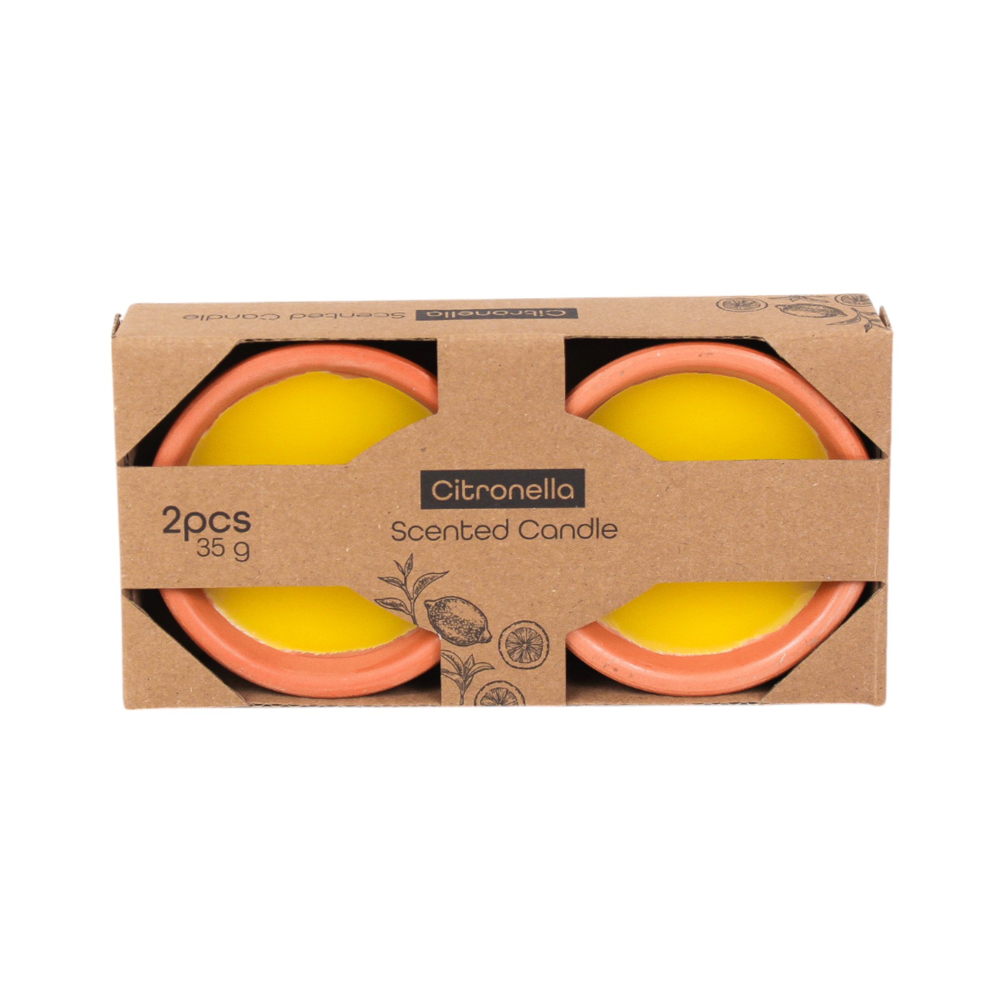 Citronella stearinlys, sett med 2 stk. Gule vokslys i to flotte terracotta skåler som måler 8.5 x 3 cm. De fine lysene er med behagelig duft som er mygg- og insektsavvisende. Passer perfekt til sommerkvelder på terrassen men kan også benyttes innendørs.