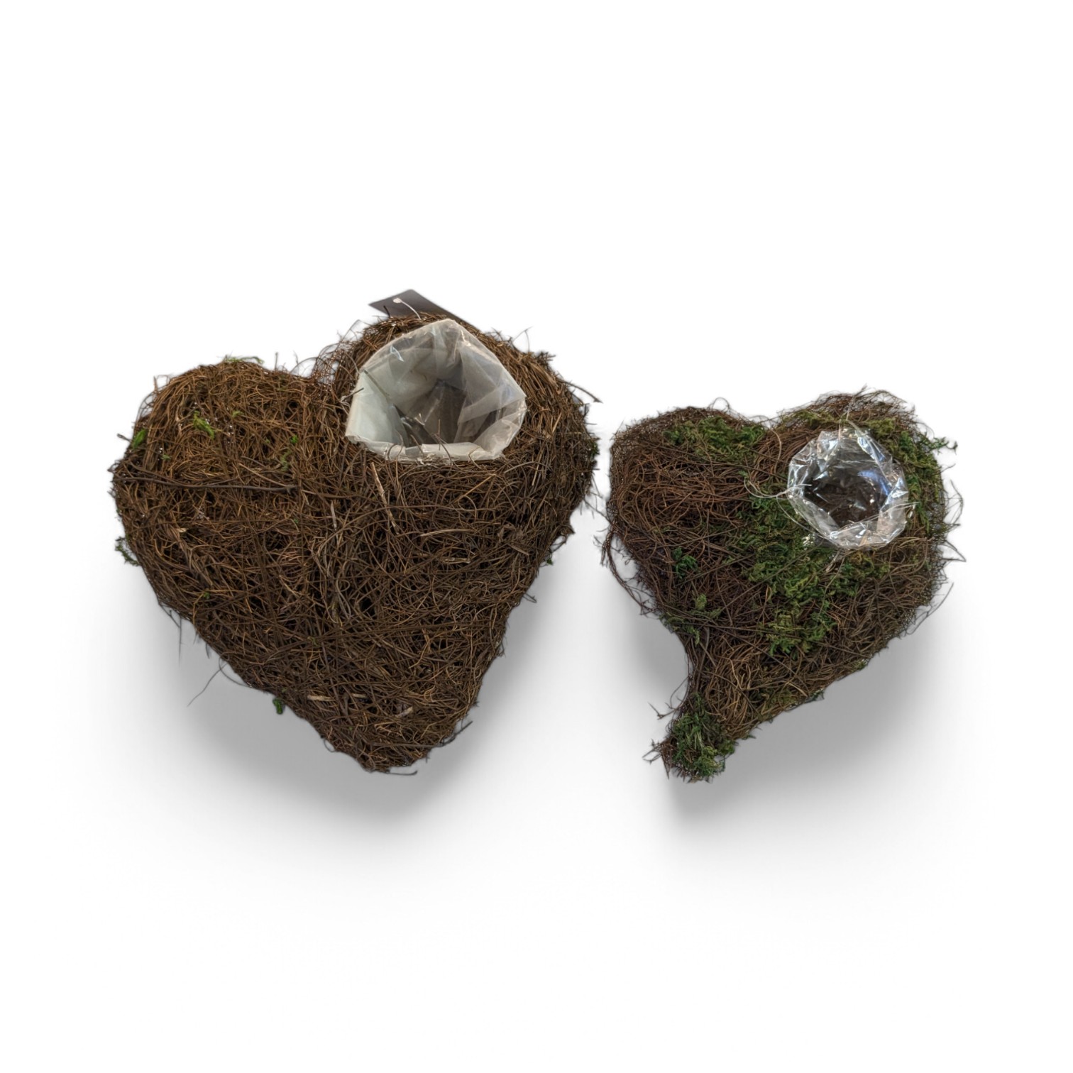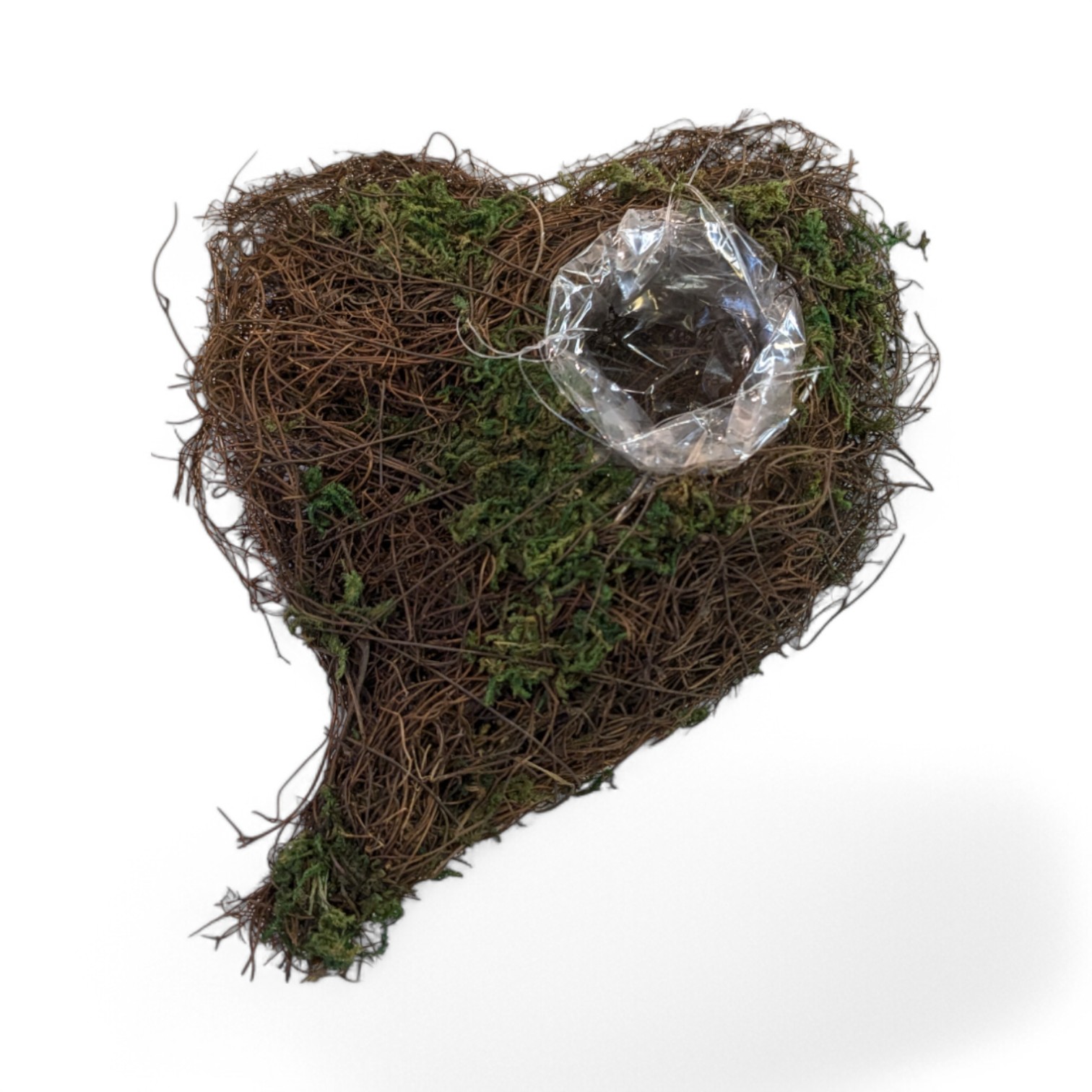 Liten skrå flettede hjerte med litt mose. Hjertet måler 15 x 19 cm. Høyde 4 cm. Diameter på hullet, 4 cm. Hullet er plassert øverst til høyre og med plastikk. Hjertet er enkelt å pynte med bær, husløk eller en krøllesløyfe i den tilhørende PVC-hulningen. På denne måten kan du sette ditt eget preg på utformingen av din pynt, uansett om det er til pynt i hjemmet, på din dør eller på kirkegården. Du kan finne flere varer til dekorasjonher.