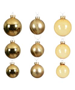 kasse med tyve styk glas julekugler i guld nuancer med og uden mønster i flere størrelser