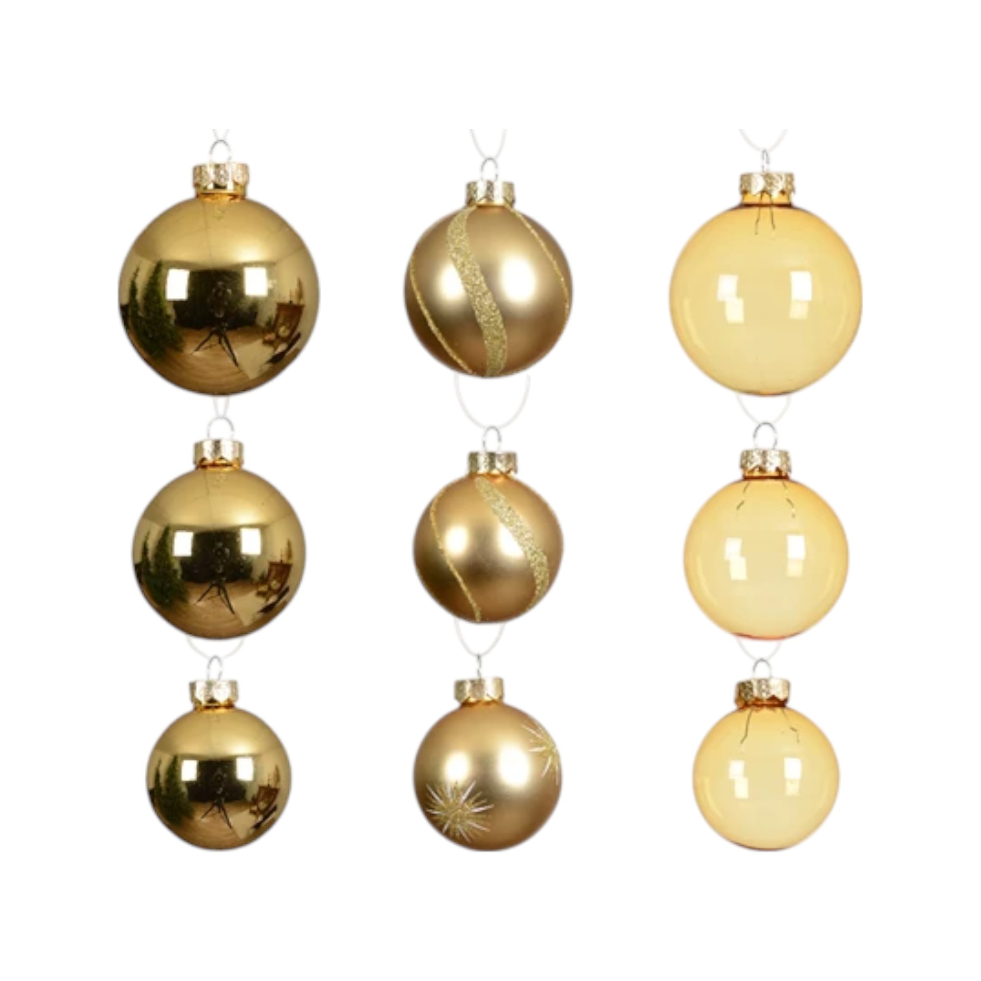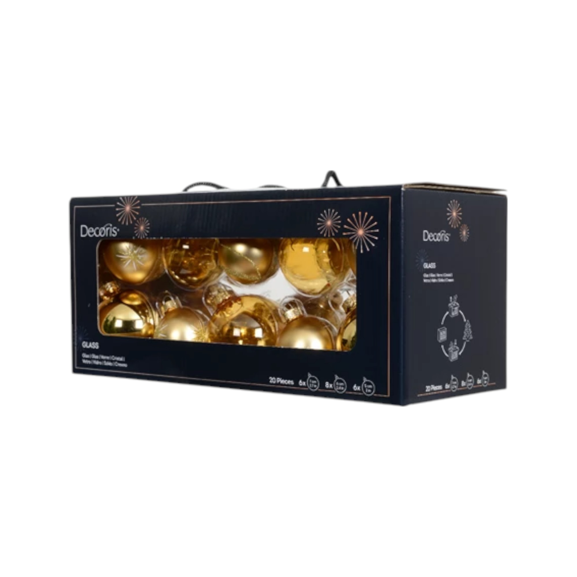 Glass julekuler i en blandet eske med 20 stk. i gull nyanser. Esken inneholder ensfargede og mønstrede glass julekuler. 6 stk. i Ø 50 mm., 8 stk. i Ø 60 mm. og 6 stk. i Ø 70 mm. Pynt juletreet ditt med disse flotte glass julekuler. Velg ett fargetema eller mix med de andre fargene vi også selger. Julekulerne leveres i en flott og praktisk kartong eske med håndtak. Behold esken til sikker oppbevaring av dine glass julekuler etter jul.
