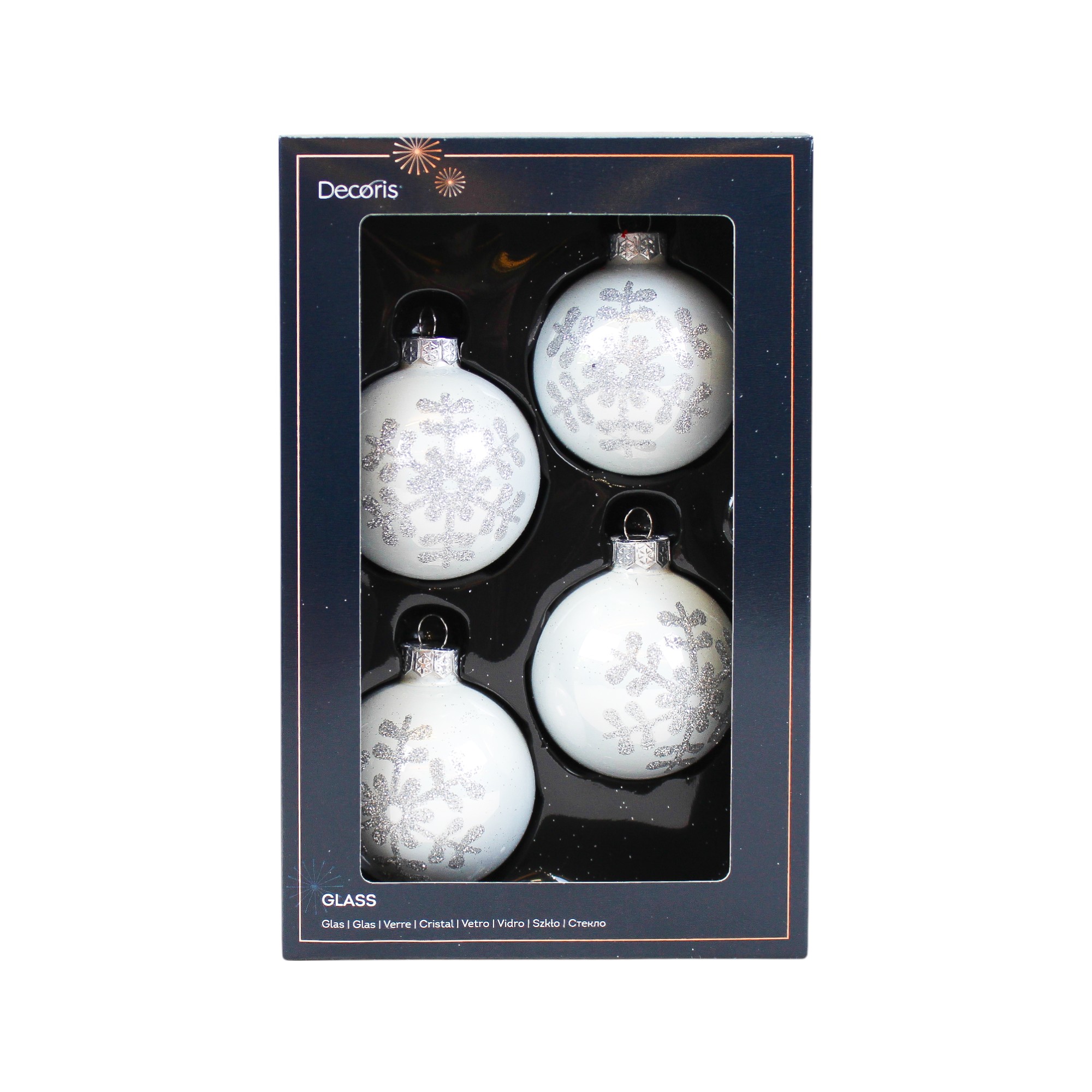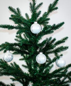 Dekorerte glass julekuler. HVITE blanke med sølv glitter snøfnugg som dekorasjon på julekula. 4 stk. like i pakken. Diameter på 6 cm. Pynt juletreet ditt med disse julekuler og juletreet ditt vil gi den perfekte julestemningen. Velg ett fargetema med samme mønster eller mix med de andre farger og mønstre vi også selger. Behold esken til sikker oppbevaring av dine glassjulekuler etter jul.