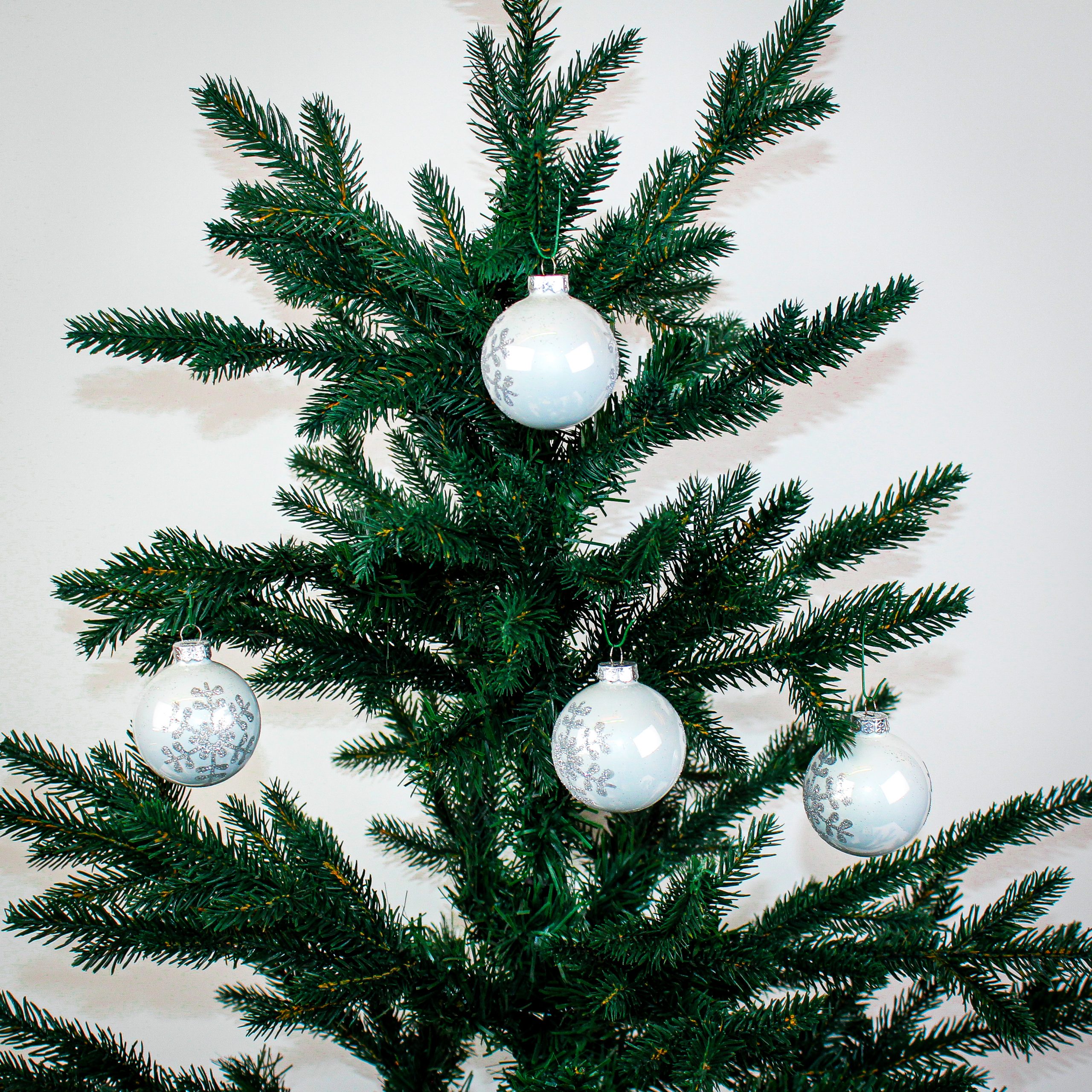 fire styk hvide blanke glas julekugler med sølv glitter snefnug rundt om på julekuglen
