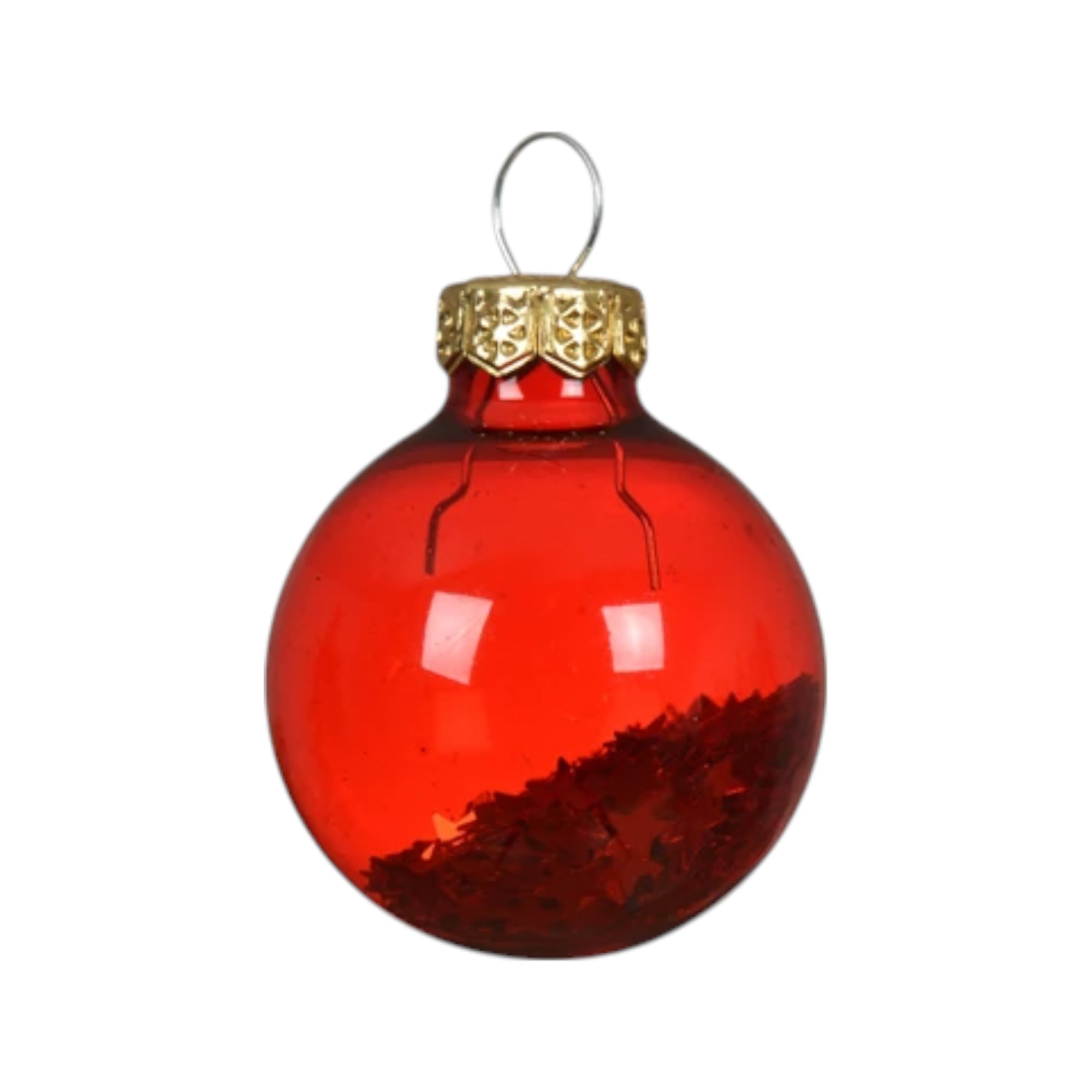 Meget dekorative små gjennomsiktige glass julekuler i en transparent klar rød farge, som gjør at man kan se de små stjernene som ligger løst inni julekula. De små julekuler er særdeles vakre på et juletre eller som pynt i en juledekorasjon. Vi har dem i flere forskjellige farger. UHØRT BILLIG PRIS!
