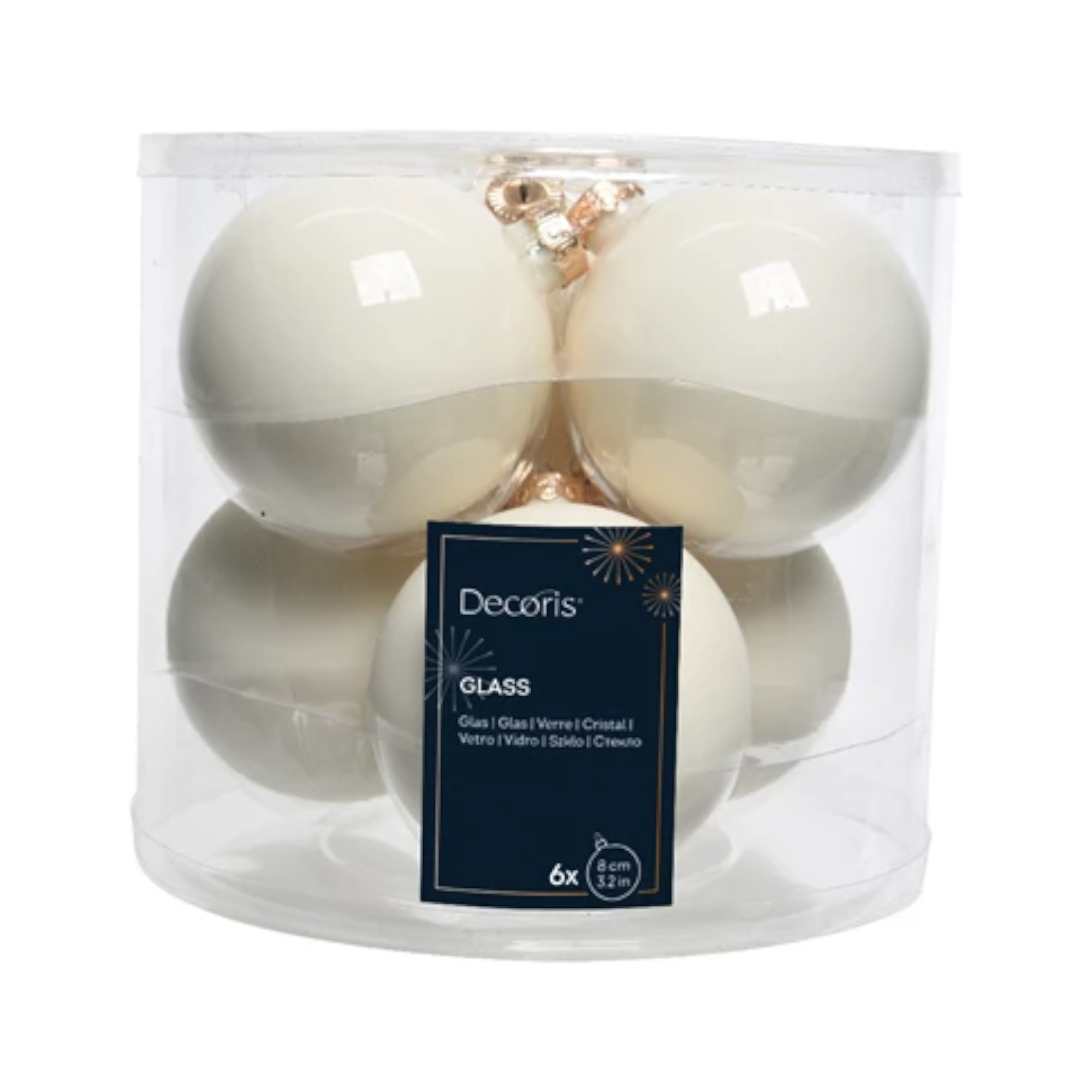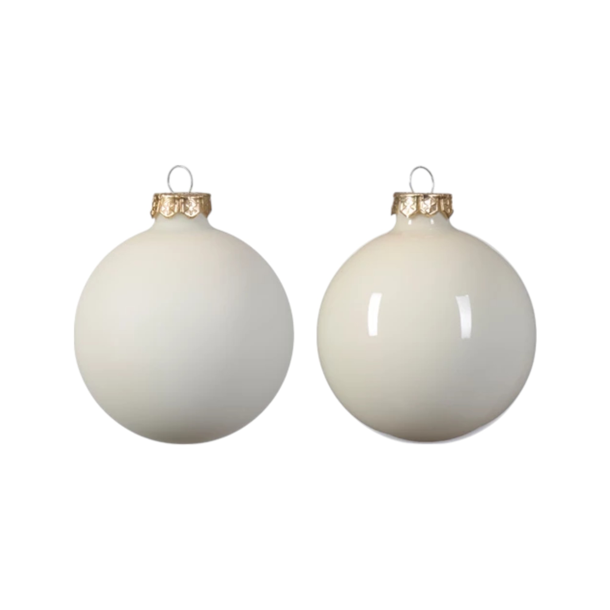 glas julekugler med diameter otte centimeter i blank og mat uld hvid farve