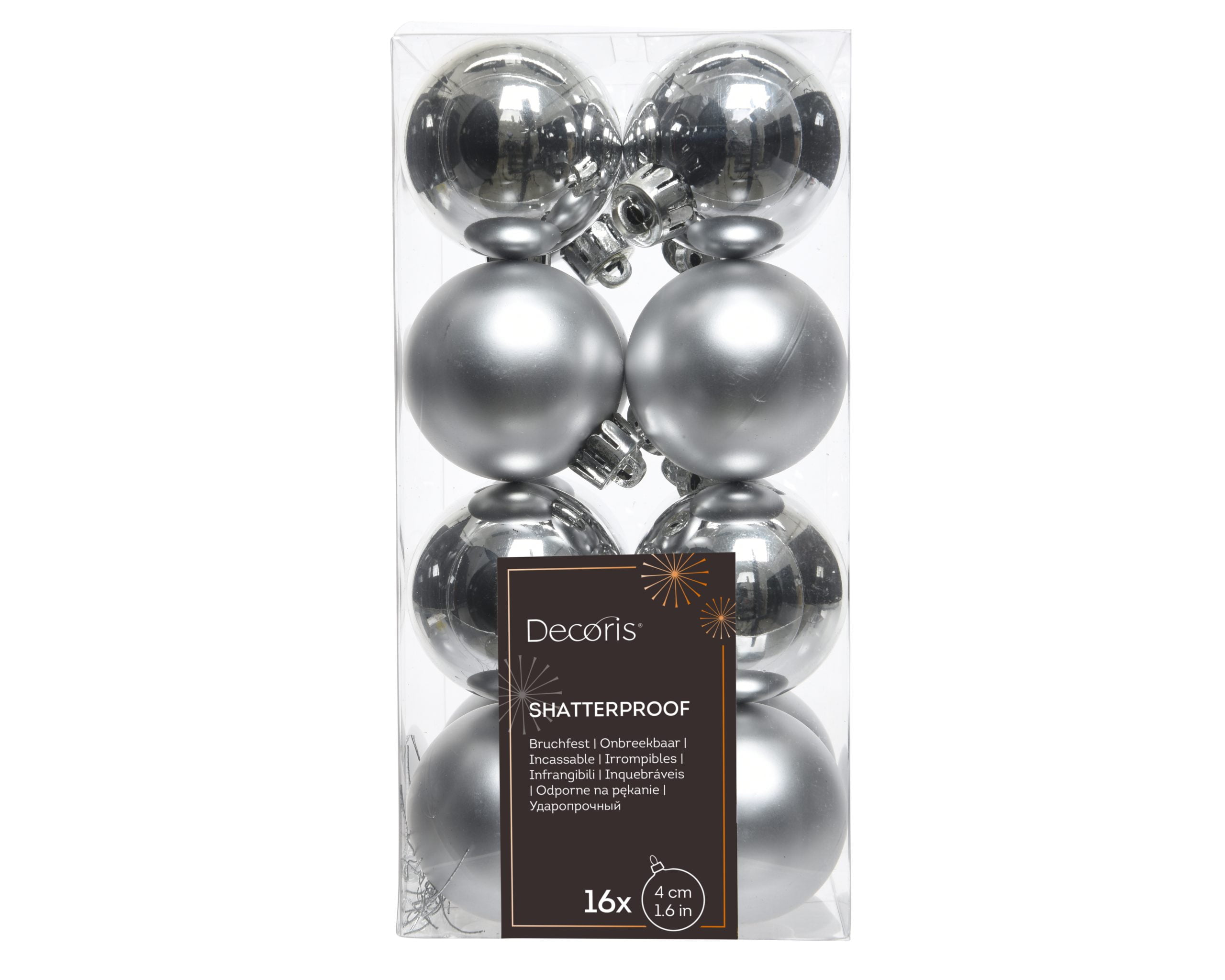 Denne pakke plast julekuler inneholder i alt 16 stk. fordelt på 8 matte og 8 blanke julekuler i en flott sølvfarge.