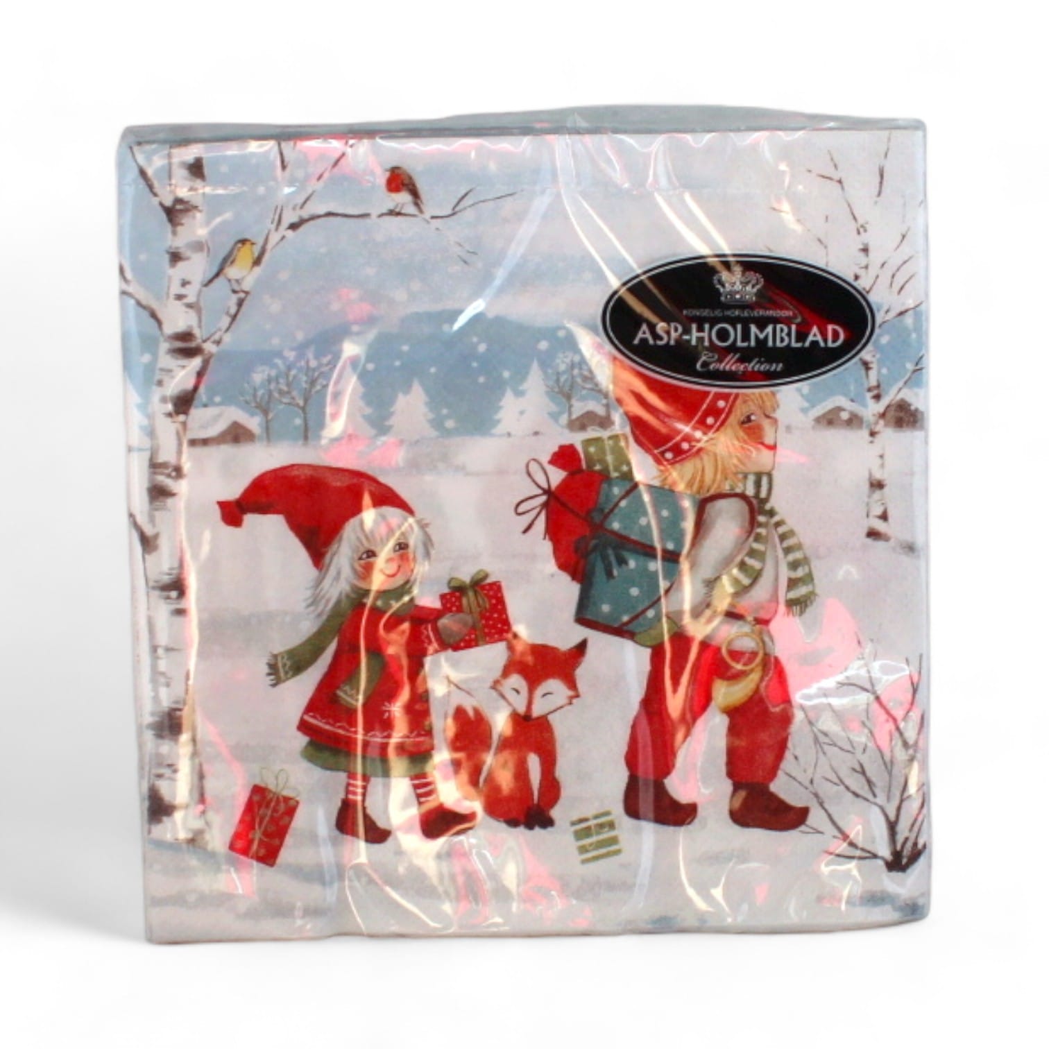 Juleservietter, hvit med nissebarn og ræv, 20 stk. Lunsjservietter