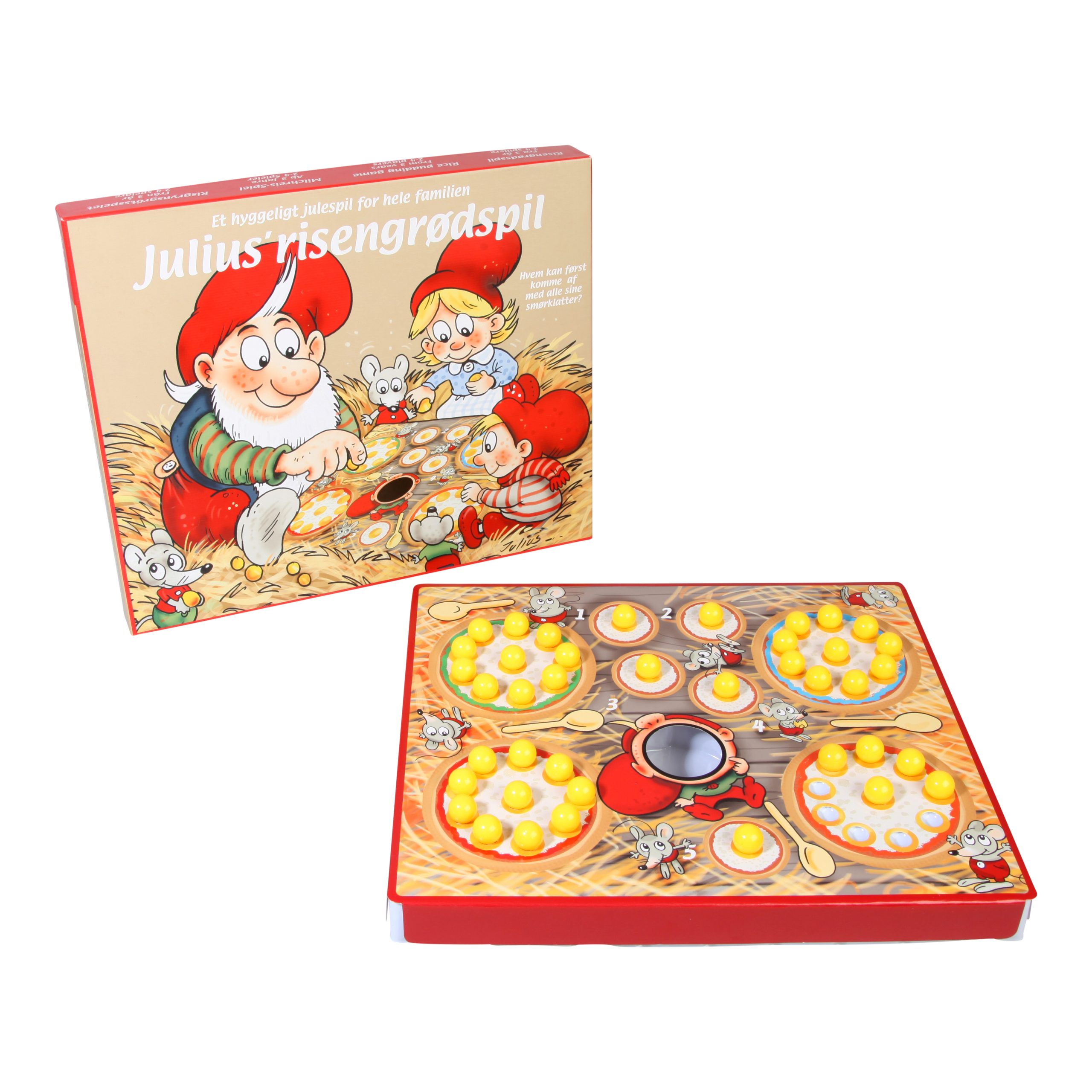 julius risengrødspil med spilleplade og smørklatter og spilleregler på bagsiden