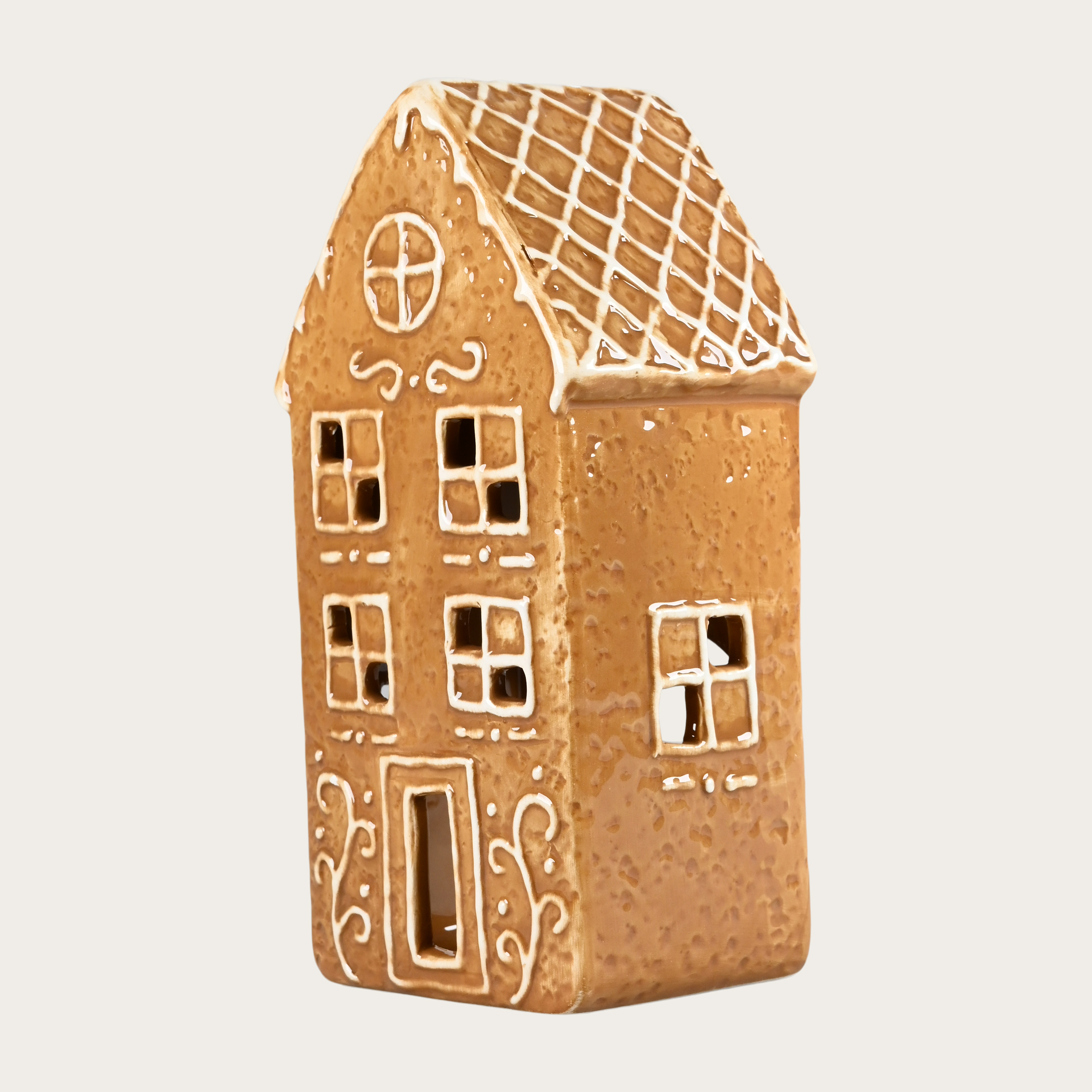 Keramikkhus til telys, pepperkakehus, lys brun, høyde 16,5 cm.