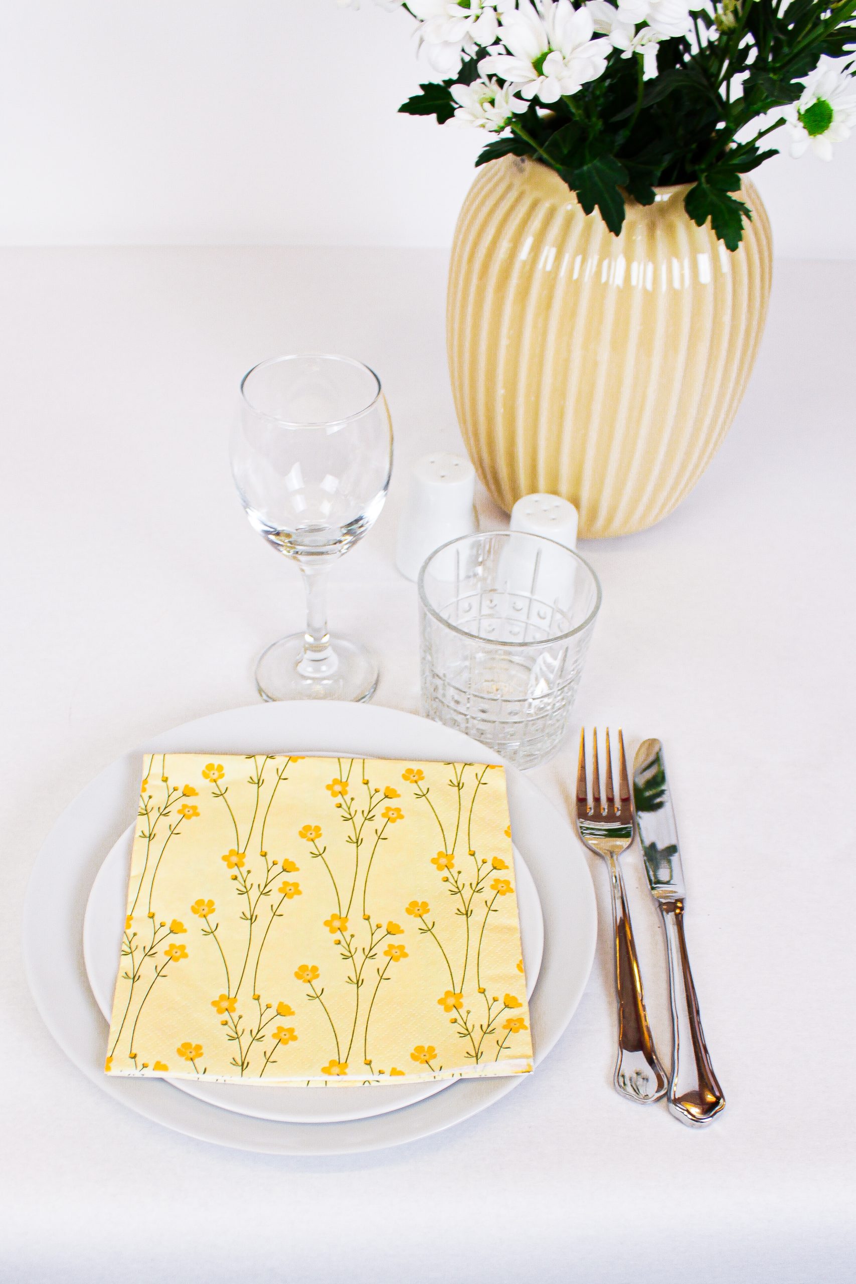 Finn hos oss flotte, søte, morsomme og billige ting til din borddekking, som disse gule servietter med smørblomster. De fleste bryr seg om å kunne dekke et flott og festlig bord, uansett hvilken årsak festen har. Er det en påskelunsj, julefest, barnedåp eller en rund bursdag? Det er viktig å få både servietter og lys i farger og tema som passer sammen. Vi har alt hva du trenger her på samme sted og også andre gadgets, som du trenger for å dekke et vakkert bord med. Har du en idé, så bruk vårt søkefelt og finn det du har bruk for. Her på Alttiljul.dk selger vi servietter og stearinlys som brukes hele året rundt. Vi har mye annet enn julepynt. F.eks. er en av våre helt store salgsvarer stearinlys, som brukes hele året rundt. Vi selger 1. kvalitets stearinlys til billige priser, fordi vi kjøper overskudd og restpartier fra en meget anerkjent dansk stearinlysfabrikk. Vår måte å kjøpe varer inn på, gjør at vi kan selge kubbelys, dekorasjonslys, stakelys, telys og alle slags stearinlys til billig pris, selv om de normalt er meget dyre stearinlys på grunn av den gode danske kvaliteten. Vårt sortiment av stearinlys og kubbelys består av gode stearinlys med en lang brennetid, men fortsatt billige stearinlys i forskjellige størrelser, former og farger. Og med våre meget lave priser på stearinlys kan du skape den helt rette atmosfære og stemning, uten at det blir en dyr fornøyelse.