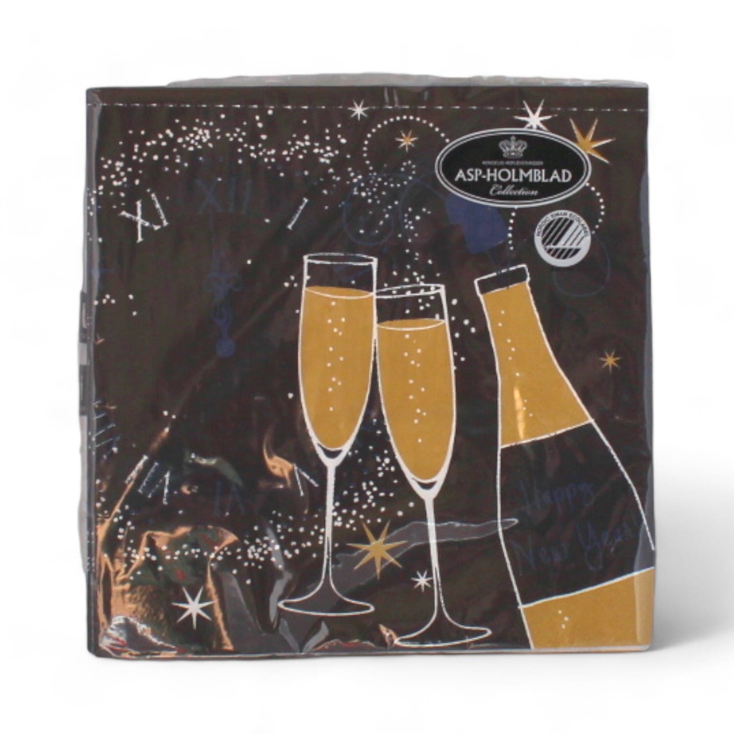 Servietter til nyttår med nyttårs champagne, SVART, 20 stk. Lunsjservietter