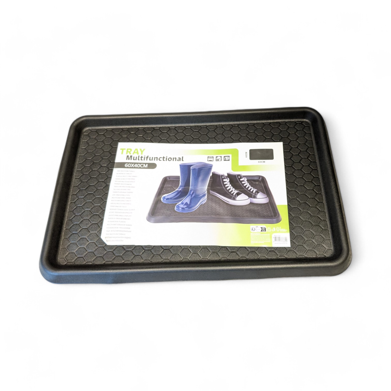 Skobakke svart som måler 60 x 40 cm. Uunnværlig til høst og vinter. Bakken har mønster i bunnen og 2,5 cm høy kant som holder skitt og vann inne. Lett å rengjøre. Bruk skobakken i hjemmet ditt, bilen din eller campingvognen din eller i verkstedet ditt. Den multifunksjonelle bakken har mange bruksområder og bidrar til å redusere skitne gulv. Materiale: Resirkulerbar plast.