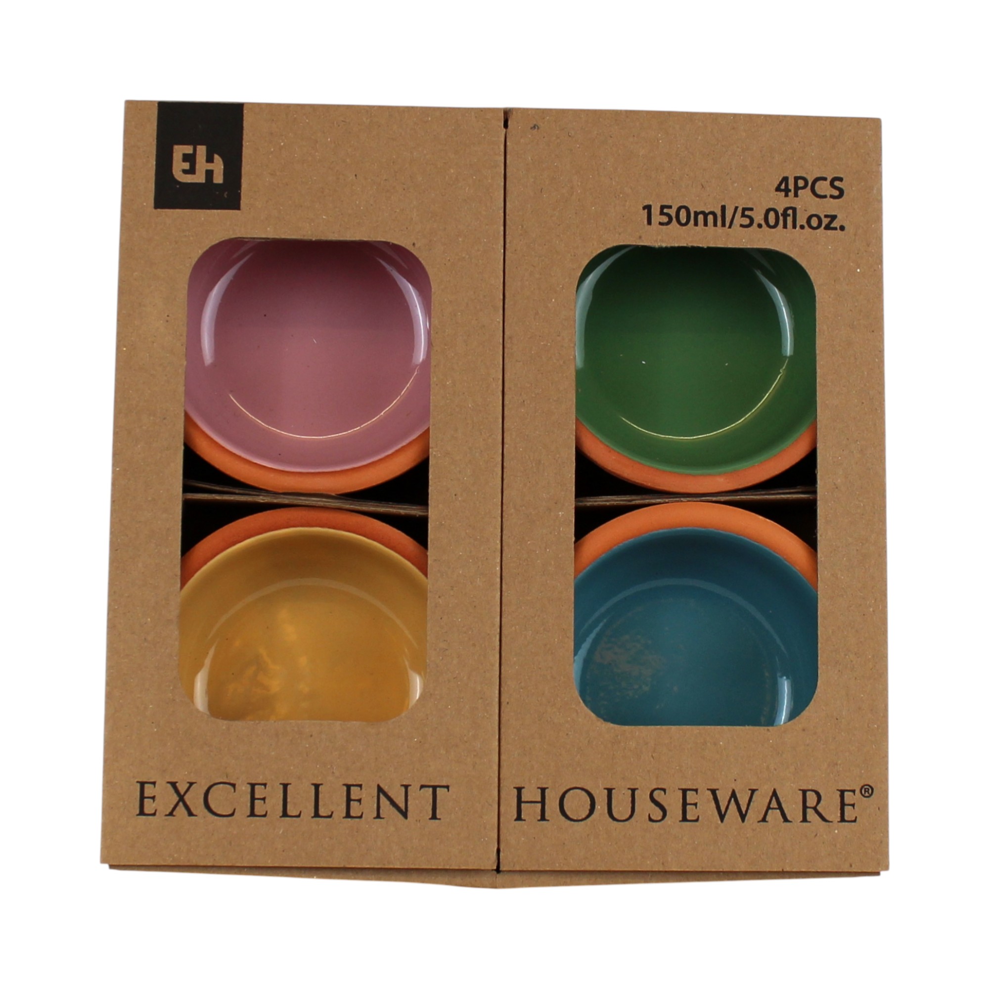 Terracotta skåler, i gull, grønn, hvit og blå innvendig glasering. Skålene måler 10 cm i diameter og har en høyde på 4 cm og kan inneholde 150 ml per skål. De er perfekte til servering av småretter eller snacks. Med en glasert innvendig overflate i 4 farger er de både stilfulle og praktiske. De tåler oppvaskmaskin, mikrobølgeovn og ovn opptil 230 grader. Pakken inneholder fire skåler.